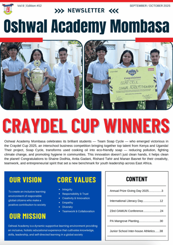 Oshwal Academy Mombasa celebrates its brilliant students – Team Soap Cycle – who emerged victorious in the Craydel Cup 2025, an interschool business competition bringing together top talent from Kenya and Uganda!